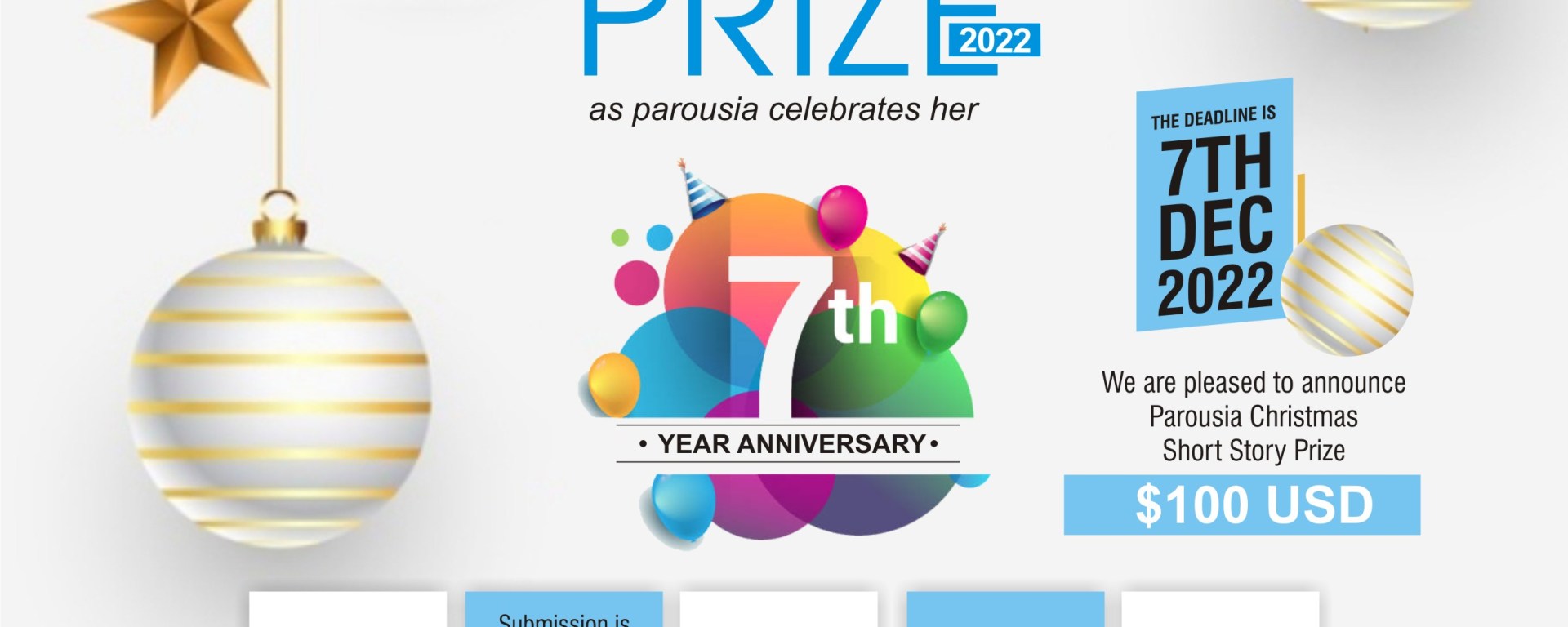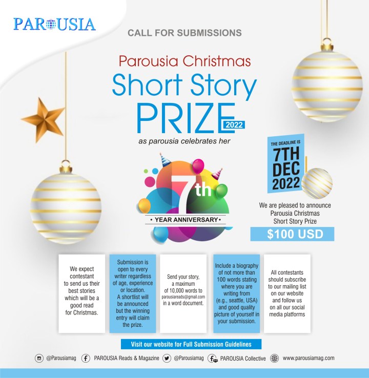 As Parousia celebrates her 7th year Anniversary, we are pleased to announce Parousia Christmas Short Story Prize 2022 with a $100 USD prize (PayPal) . We expect contestant to send us their best stories which will be a good read for Christmas. Deadline is 7th December, 2022.