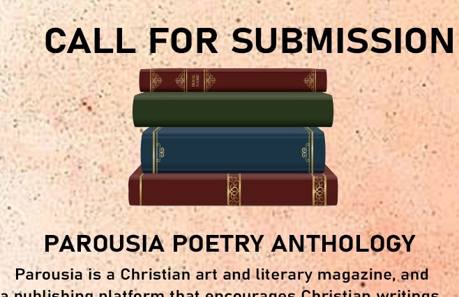 Parousia Poetry Anthology Parousia is a Christian art and literary magazine, and a publishing platform that encourages Christian writings and art works. Parousia is looking for Christian themed poems for its Poetry Anthology. Submit 1-3 Christian themed poems Deadline is … Continue reading Call for Submissions | Parousia Poetry Anthology | PAROUSIA Magazine